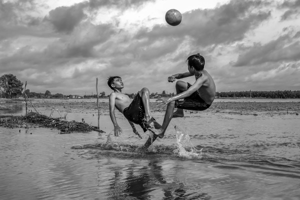 Two Buddies Playing Soccer Bw